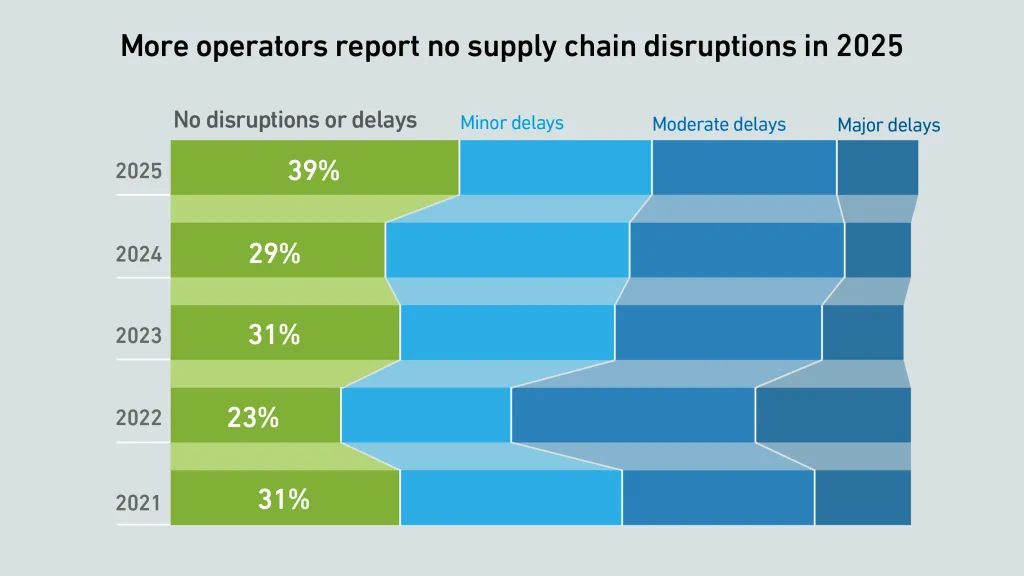 Operators report fewer supply chain disruptions in 2025, but delays remain common. Access to key equipment and progress on capital projects still vary by region and segment, even as demand continues to add pressure.