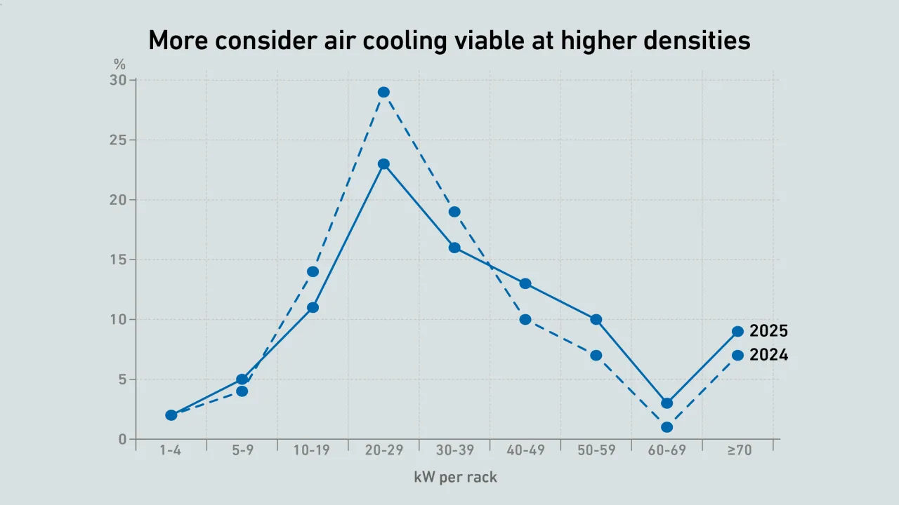 Against a backdrop of higher densities and the push toward liquid cooling, air remains the dominant choice for cooling IT hardware. As long as air cooling works, many see no reason to change - and more think it is viable at high densities.