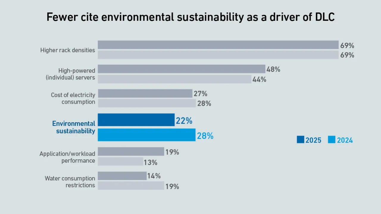 Uptime's 2025 cooling survey found that fewer respondents cited sustainability as a primary driver for direct liquid cooling (DLC). Gradual advancement of DLC plans may be refining operator understanding of its incentives.