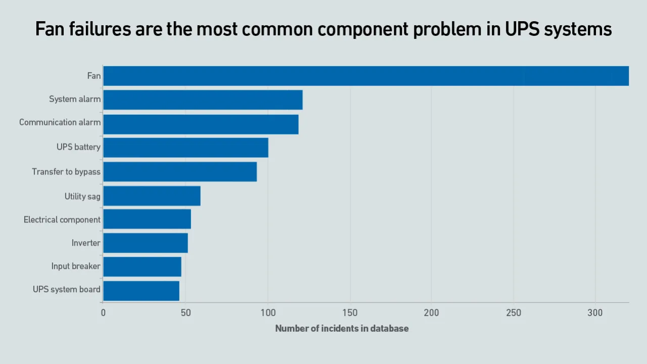UPS systems are the number one root cause of significant and severe outages. Analysis of reliability data from data center management software provider Fulcrum Collaborations sheds more light on the prevalent UPS component failures.