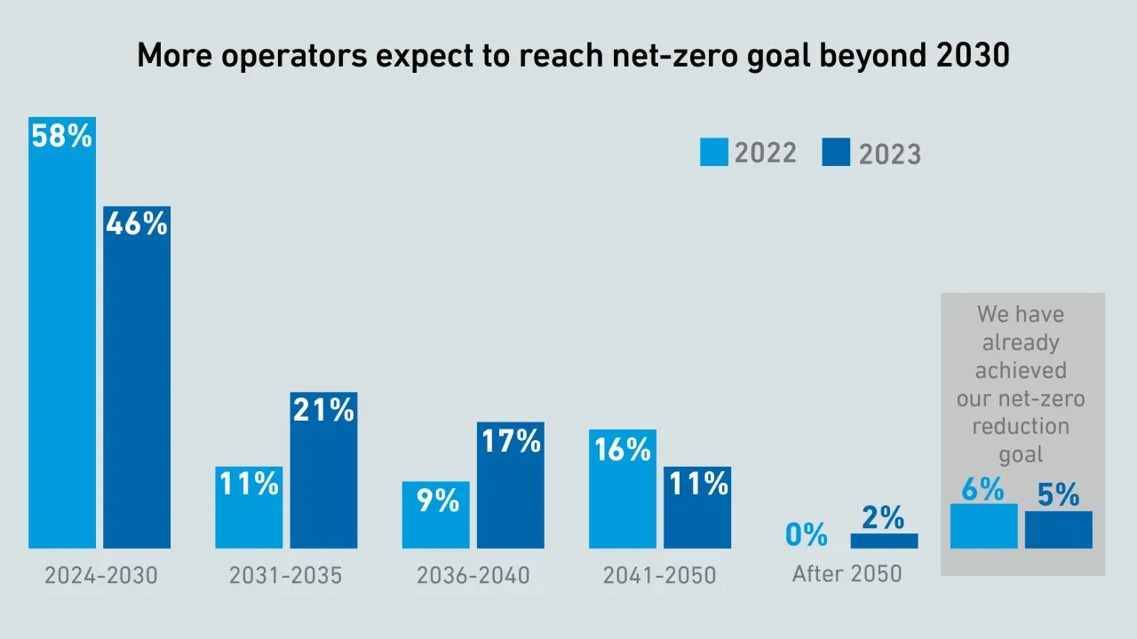 Goals for achieving net-zero emissions by 2030 are being extended, according to Uptime Institute survey data. This is likely driven by stricter reporting requirements, rising costs and limited availability of carbon-free energy.