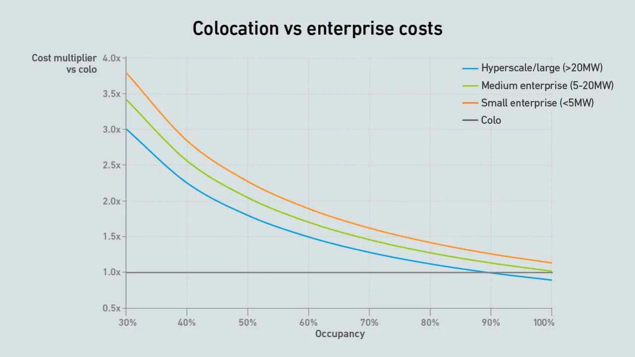 Simple arithmetic shows that newly constructed, large-scale private data centers with high occupancy rates can sometimes undercut colos on unit costs, but in most cases colos remain significantly cheaper.