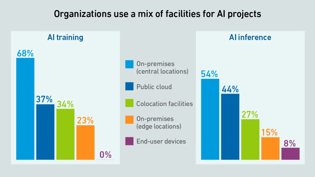 Organizations currently performing AI training and inference leverage resources from a mix of facilities. However, most prioritize on-premises data centers, driven by data sovereignty needs and access to hardware.