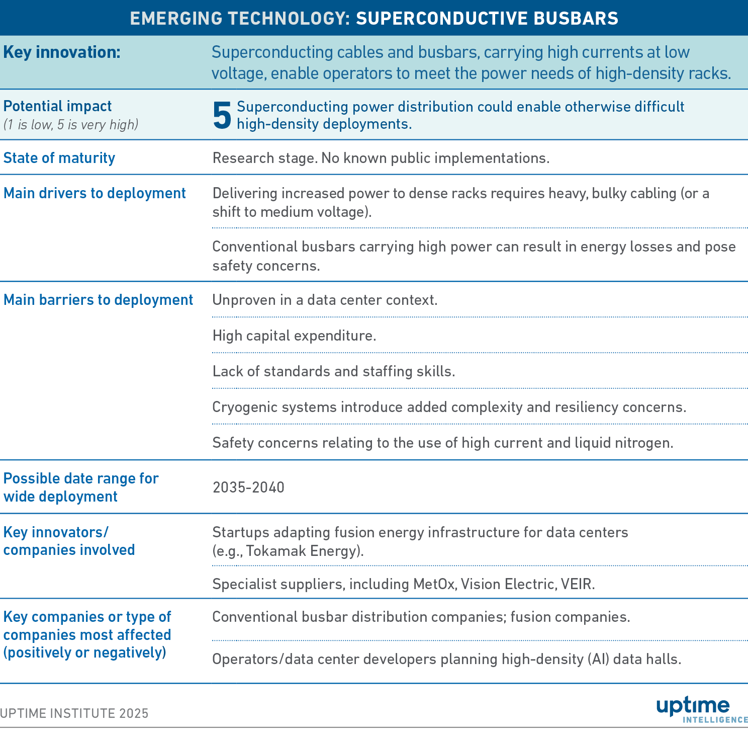 Vision Electric and VEIR are publicly offering superconducting busbars for data center use, although Uptime Intelligence is not yet aware of any successful implementations. Fusion developer Tokamak Energy is expected to introduce HTS busbars for data centers but has not disclosed further details.
