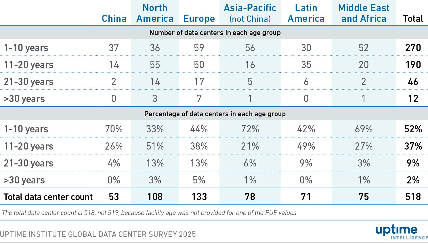 China, APAC, and the Middle East and Africa regions have relatively young data center fleets, with roughly 70% of data centers aged 10 years or less (see Table 4). North America, Europe, and Latin America have older data center fleets, with 33-44% aged 10 years or less and 38-51% aged 11 to 20 years. Overall, only 11% of reported data centers are 21 years or older.